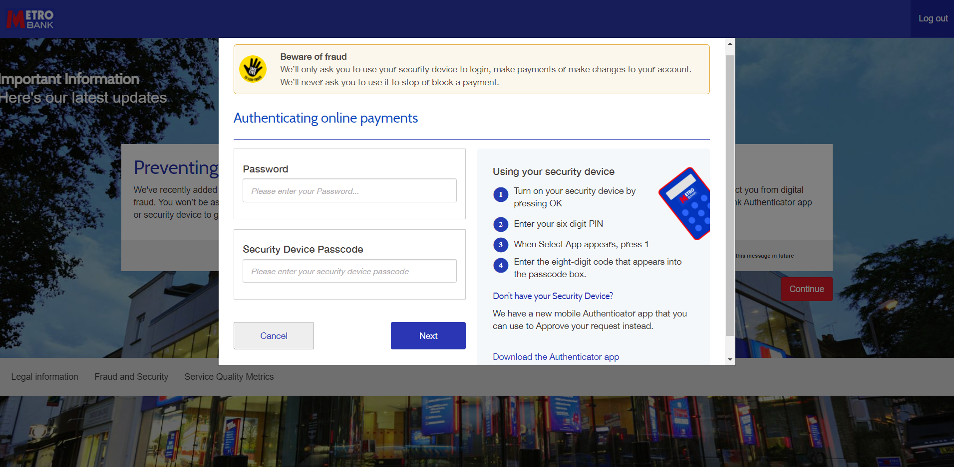 Step 3 – if using the Metro Bank Authenticator app – Enter security details
