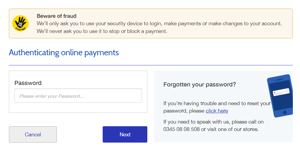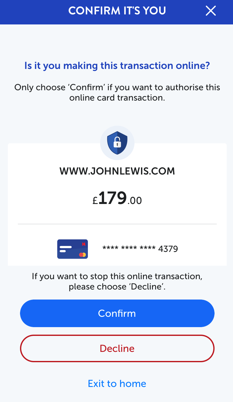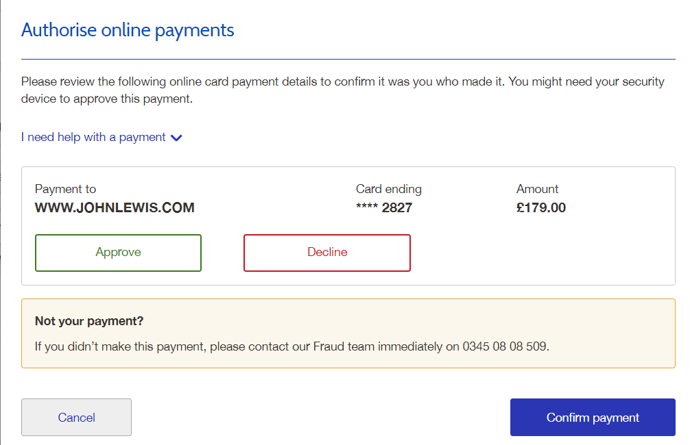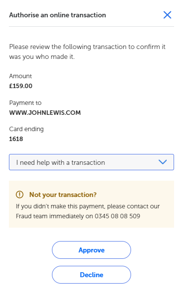 Click ‘Transaction approvals’ in the top left corner of the home page. If your transaction still does not appear, please return to the retailer’s site and make the payment again. If you still can’t see it in Online Banking, contact us at 0345 08 08 500.
