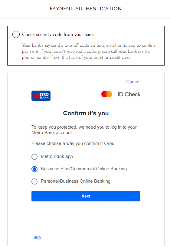 When you’re shopping online, you might see a screen like this. You will need to choose how you are going to confirm it’s you making the transaction.